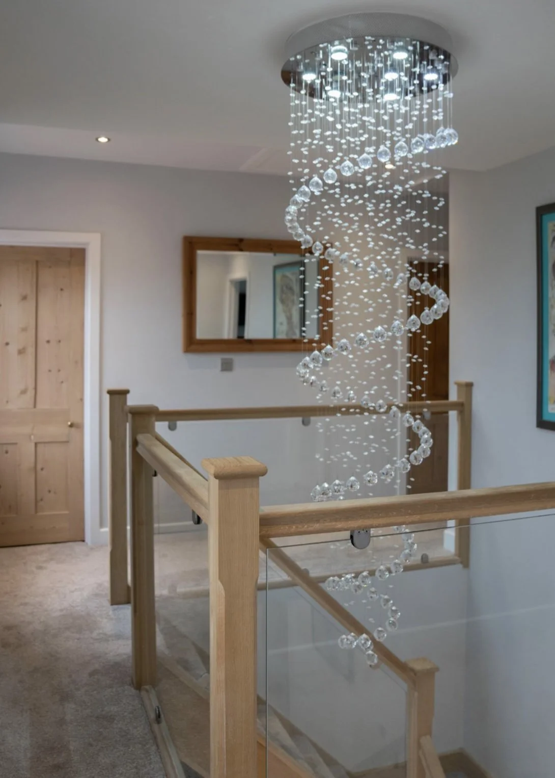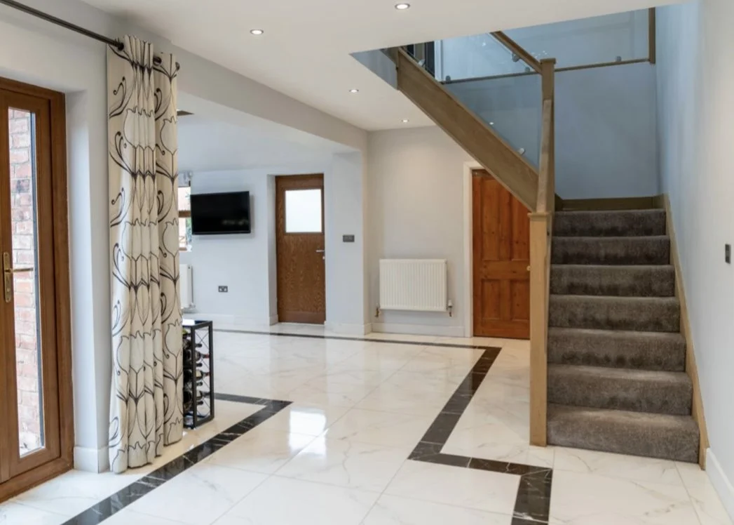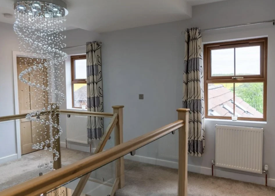 With a new grand entrance hall giving an immediate ‘wow’ factor, we added in a centralised oak and glass staircase and minstrels’ gallery above where the owner has included a contemporary crystal chandelier, cascading down to add to the welcoming and stylish ambience.
